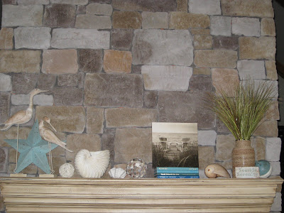 This picture of the mantle looks very washed out, I promise it looks much better IRL. I have used beiges, and creams, and whites, with touches of aqua to match the dishes. The tall sea birds are from Cracker Barrel, the biggest shell planter is from Michael’s, the shell balls are from TJMAXX, the pic from Target is propped on some old books I have, the next shell is a real one, then the vase with the cording is from Michael’s…I just added some sea grass(faux). The tiny metal sign says ‘Seaside Serenity’. Then the little buoy and star are from Jo Ann Fabrics. I like to GATHER decor items from many places. I’ll see if I can get Adam to make a better pic of this to show you.