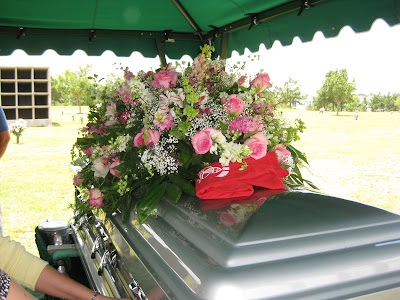 The beautiful blanket of flowers for the casket. Red shirts on top are the shirts our Women On Mission Team wore each year. Several were brought to the gravesite.