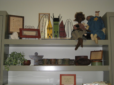 Over my washer and dryer are these shelves where I have a few of my favorite things. Nothing of value, but sentimental memories and gifts from treasured friends. I did some of the needle work in the samplers.