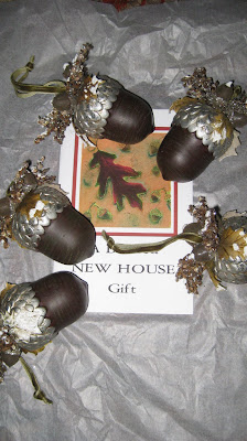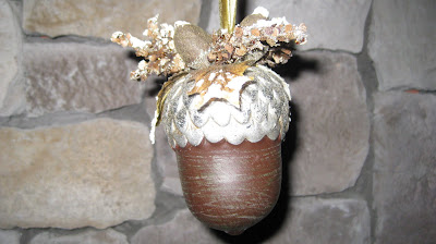 Aren’t they beautiful? I can hardly wait to put them in a special place on my tree. But, I didn’t want to put them away, so I looked for a place to hang them in the mean time. AHA! My eyes lit upon my manzanita branches. Now, I have been told by several ‘friends’ and family to “Please, get rid of those spiky trees!” Don’t plan to, though, I love the structure and architecture of them. I have, however, found a place for them in the library, that is out of the way. So, if they bother anyone where they are now…it’s your own fault! I took my acorn ornaments and hung them on these branches. And, I love to see them hanging there. Looking out the window, it is evident that fall is here, and inside, these little acorns carry that theme as well. However, as soon as I get a tree, they will move over and grace it with their beauty.