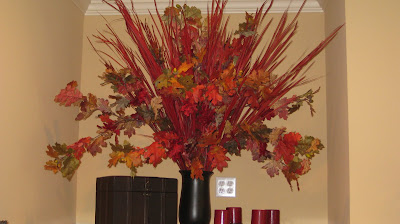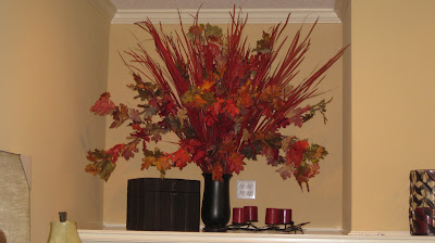 The den has these 2 huge open areas on either side of the fireplace. So, that’s what we started with. We found 2 large urns, some padded leather boxes, and a horizontal candle holder. Because we are such fine shoppers…we managed to find some wonderful silks at Pier 1. These stems were $2.60 each marked down from $8.00!