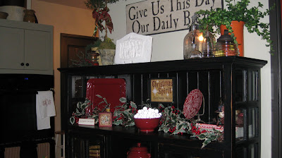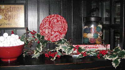 Inside the little niche, I covered all with a holly and twig garland. On the right is a stack of my Christmas books, topped off with a jar of little rag balls. A little red plate, found this year at Pier 1, sits beside the books. [Loved this dessert plate, with the church on it…wish they made it in a larger size. I just bought one…to use for display]