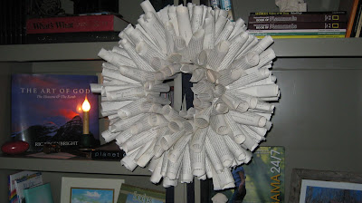 This is a wreath I made using pages from an old book. It really was a terrible old paperback that had no redeeming value. I tore each page out, rolled and glued it, then glued it to a foam wreath form…