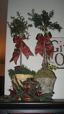 On the top left are 2 rosemary topiaries…with a little Christmas finery added…