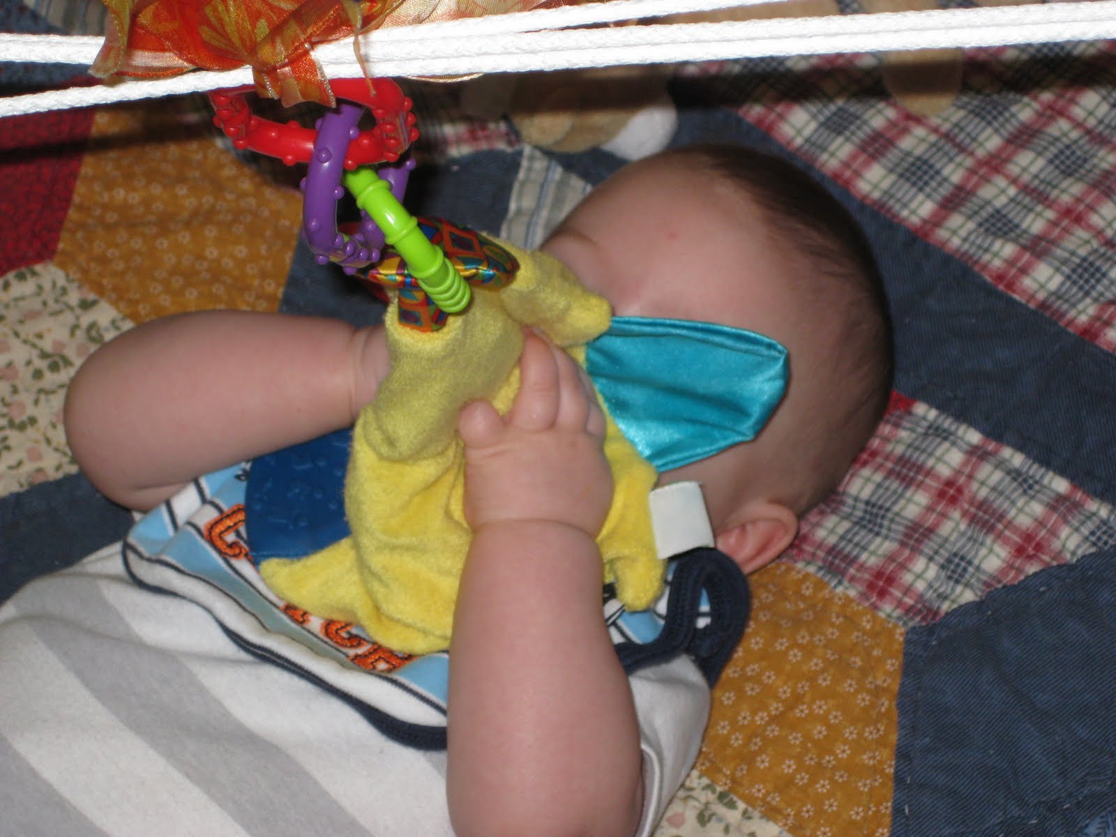 Well, when he sits in his carrier, it has a bar that toys hang from. Which excites him greatly! When he rides in his car seat in GiGi’s car, there are toys tied everywhere for his amusement. But, at Aunt Tonja’s house…there is nothing that hangs above his head for him to grab and teeth on and wad up and gnaw on. And, he obviously misses his toys because he doesn’t tarry for very long on my face.
