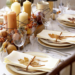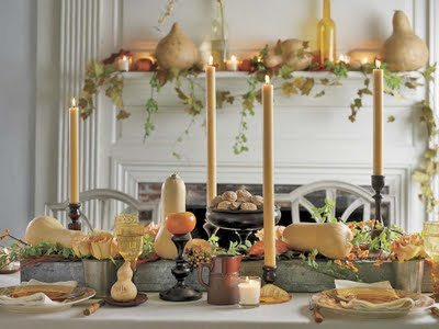 Can you believe that it is almost Thanksgiving? Of course, to be in the stores…you would think we didn’t even celebrate Thanksgiving anymore. I even went in one store where they had a big clearance table that had all the Halloween mess and the Pilgrims and cornucopias on it! Hello-O! Thanksgiving hasn’t even gotten here yet. It’s very sad to me. Anyway…in case you feel, like I do, that Thanksgiving is an important day, and should be celebrated as such, I have gathered some pics of lovely tables and centerpieces that I think you may enjoy seeing.