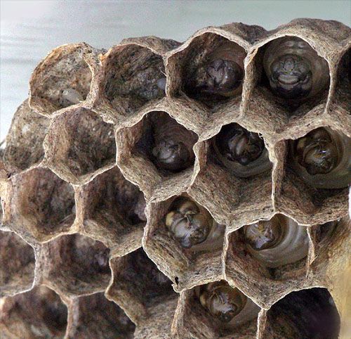 Then the workers began covering over all the cells. It seemed to us that they were working harder than ever. Soon the entire nest…all the cells…were covered over with what looked like the same papery substance they built the nest out of…just thinner. We continue to watch…and watch…and soon…we could see movement in each cell. Those things were squirming around in there! This was not something that I particularly enjoyed watching. It really creeped me out. But, I wanted to see what was happening. I relied on Alex to keep me up to date when I just could not bring myself to look.