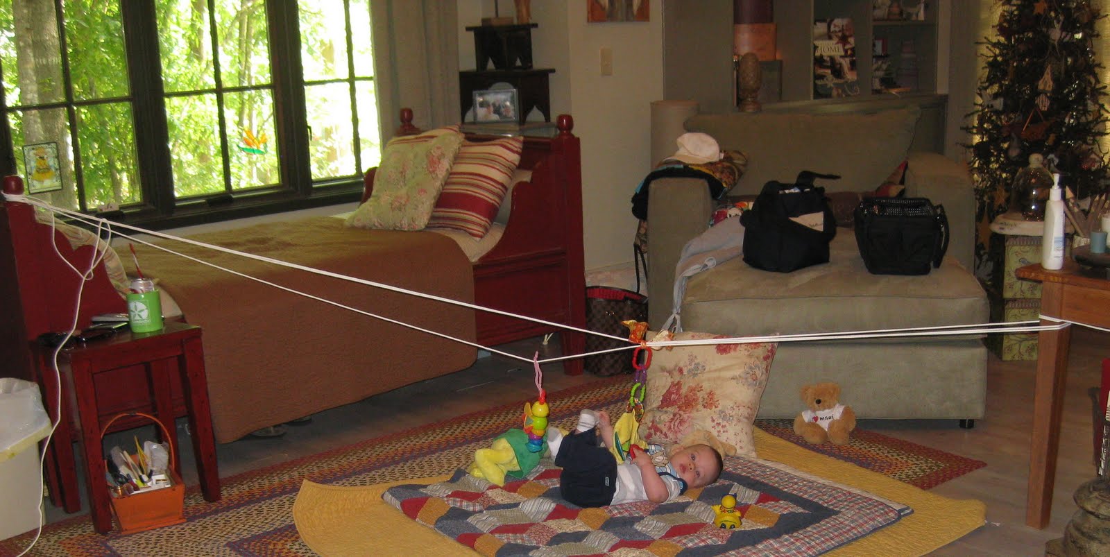 So, using what supplies I had on hand, I set about to build a playground for Master Bush. I needed something to hang toys from, and whatever I hung the toys from needed to be suspended overhead of baby boy. First, I found some old macrame cord. I used to be quite a good macrame knot tying artist. I made plant hangers for every post me or Mom or Joy ever had. And, they were fine ones, too. And, purses! Oh. My. Goodness. Purses of every color, shape, size that you could imagine! I gave them away, I sold them, I made them for everyone who even thought they wanted one. I even made a table. Yes, a table. A hanging table,but a sturdier table you could not find in all of the city.