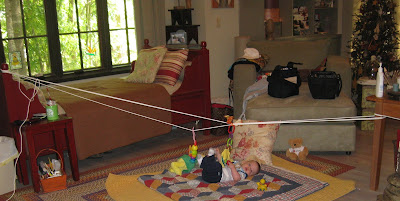 Ignore, please, the condition of the room. There are several things out of place today and there will probably be several things out of place tomorrow, too! Notice the specialized cording tied to the table leg on Right, and the bed post on the Left.