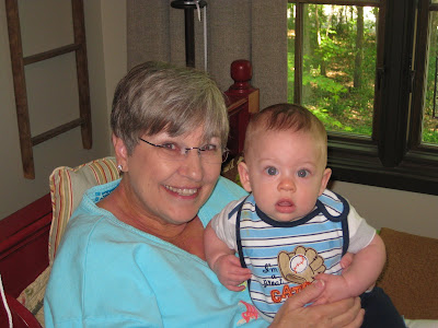 Well, when he sits in his carrier, it has a bar that toys hang from. Which excites him greatly! When he rides in his car seat in GiGi’s car, there are toys tied everywhere for his amusement. But, at Aunt Tonja’s house…there is nothing that hangs above his head for him to grab and teeth on and wad up and gnaw on. And, he obviously misses his toys because he doesn’t tarry for very long on my face.