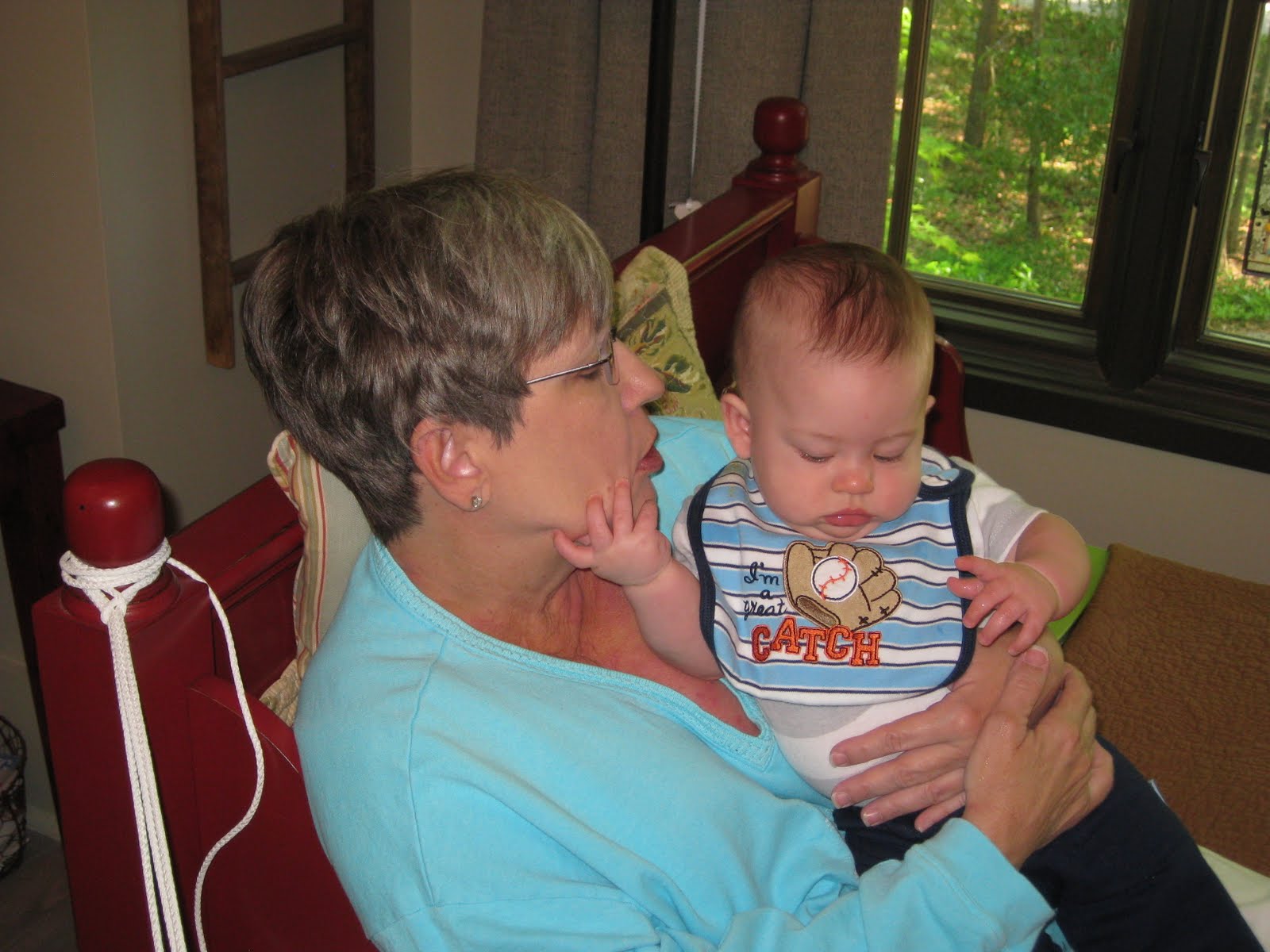 Well, when he sits in his carrier, it has a bar that toys hang from. Which excites him greatly! When he rides in his car seat in GiGi’s car, there are toys tied everywhere for his amusement. But, at Aunt Tonja’s house…there is nothing that hangs above his head for him to grab and teeth on and wad up and gnaw on. And, he obviously misses his toys because he doesn’t tarry for very long on my face.