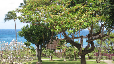 We slept till about 9 this morning, and after making ourselves presentable, went to explore our surroundings. The grounds here are exquisite! So many varieties of plant life, and all manicured so beautifully! This hotel has the distinction of being the most Hawaiian Hotel on Maui, and it is dedicated to the preservation of the ancient arts that the Hawaiian people once practiced. There are many demonstrations of the arts here all through the day…lei making, weaving, hula,which I am quite good at, 🙂 carving,etc. And at all times of the day, there is live music. Traditional Hawaiian music, ukulele, slack key guitar…just delightful!